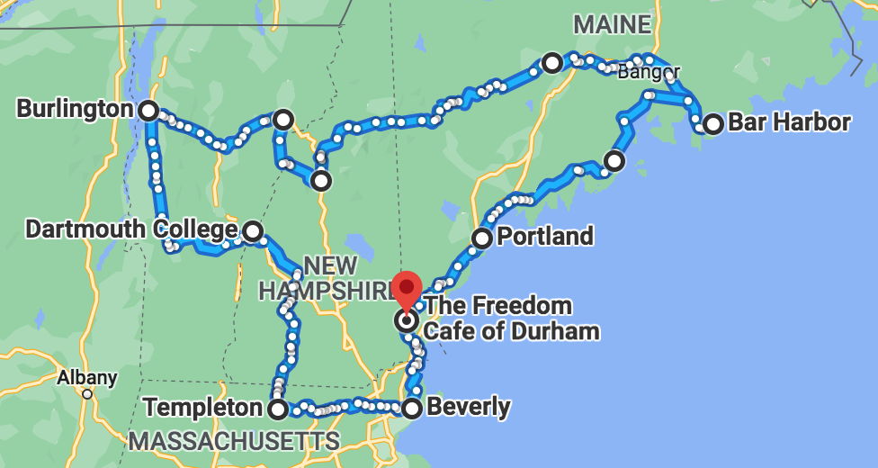 Our crew will travel clockwise on the map for 19 days including 3 rest days, traveling through Massachusetts, Vermont, and Maine and aim for an average of 62 mi. per day. From Café front door to Café front door.